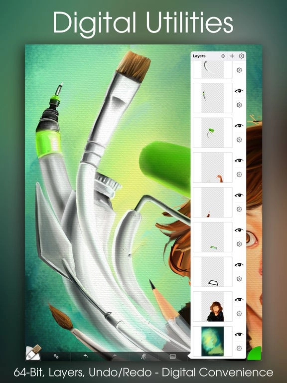 多样化的工具包括油画笔、水彩、铅笔和喷枪,模拟真实物理属性如油漆厚度和铅笔柔软度。