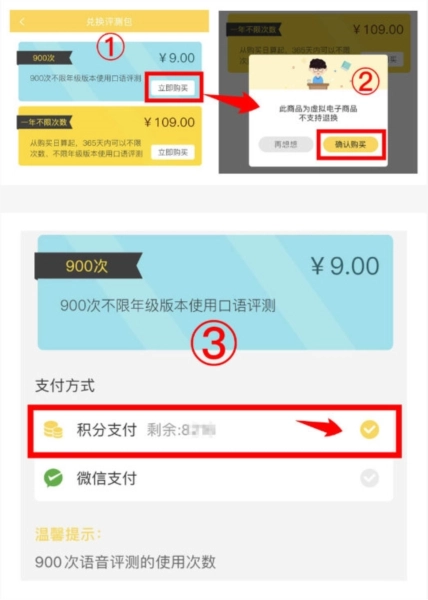 2. 积分可兑换口语评测次数、电子教辅等资源(900积分=900次评测)