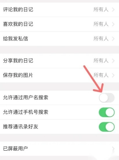 4. 关闭"允许通过用户名搜索"开关,有效防止他人搜索到你的账号。
