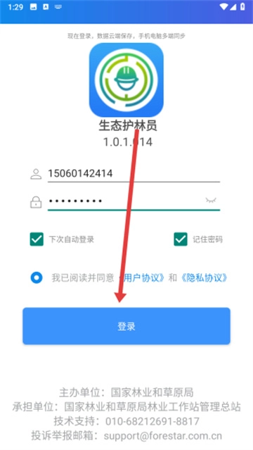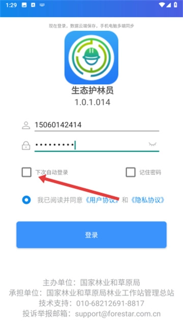首次登录操作:勾选用户协议框,输入注册手机号及密码,开启自动登录选项减少重复操作。