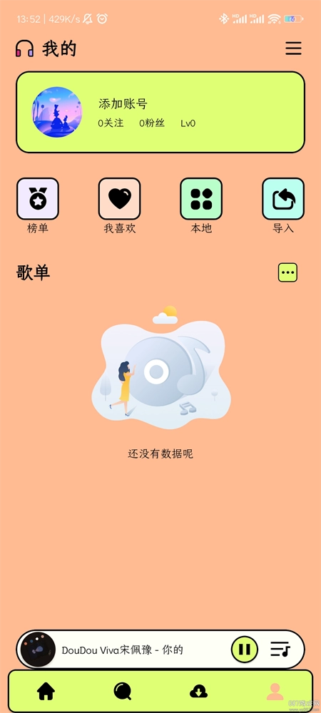1、打开软件,我们能够看到一个非常卡通精美的软件界面,在这里不仅汇聚了一系列我喜欢、白噪音、抖音热曲、榜单、歌单广场等一系列板块而且更是支持搜索功能。