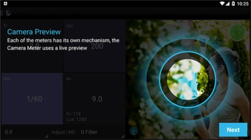 3、使用内置摄像头,您可以拍摄要测量的场景的照片;LightMeter将计算该场景的曝光并显示它;