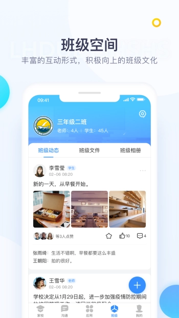 1、提供专业且完善的业务支持,内置即时聊天、班级圈、作业等应用;