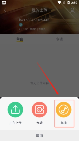 6、即可将本地的歌曲上传(小编本地没有歌曲~)