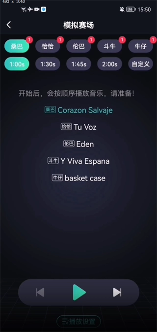 点击此处即可开始模拟比赛,如果此时你想要更换音乐/顺序,点击下方【播放设置】即可重新定义更换。