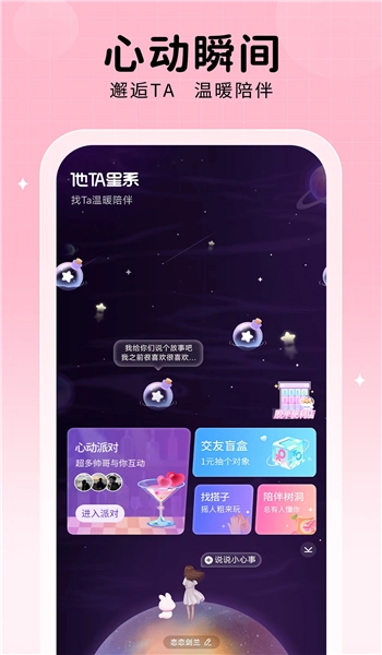 他ta星球通过强大的语音聊天功能,用户可以与来自世界各地的小伙伴进行连麦互动,支持私聊、群聊等多种交流方式,让你在语音的世界里畅所欲言。同时,软件还提供了“圈子”功能,用户可以根据自己的兴趣爱好加入不同主题的社群,比如音乐、游戏、读书、动漫等,在共同的兴趣中找到志同道合的朋友。
