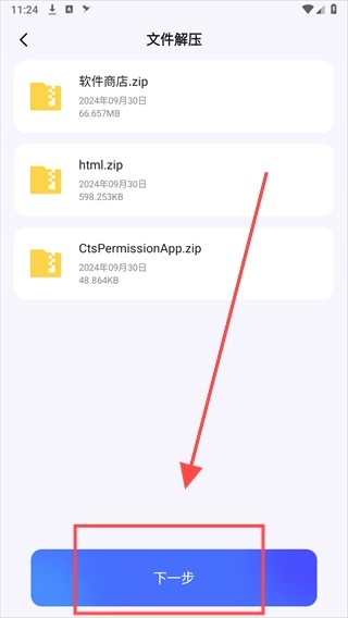 2. 接下来,进入文件解压界面,挑选需要解压的文件,点击【下一步】按钮。