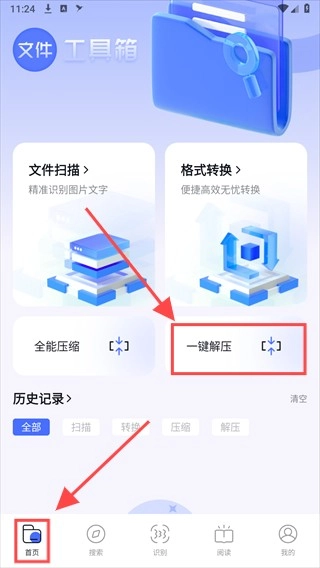 1、第一步,用户进入下方靠左的【首页】界面,点击该界面中的【一键解压】功能。