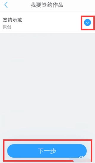 8、勾选准备申请签约的作品,然后点击【下一步】