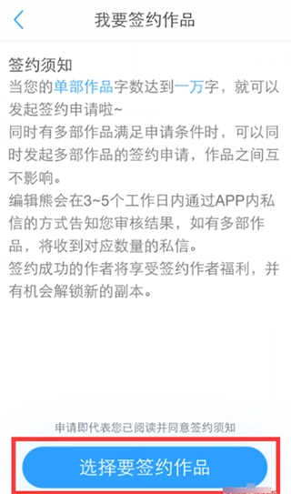 7、仔细阅读【签约须知】后,点击下面的【选择要签约作品】