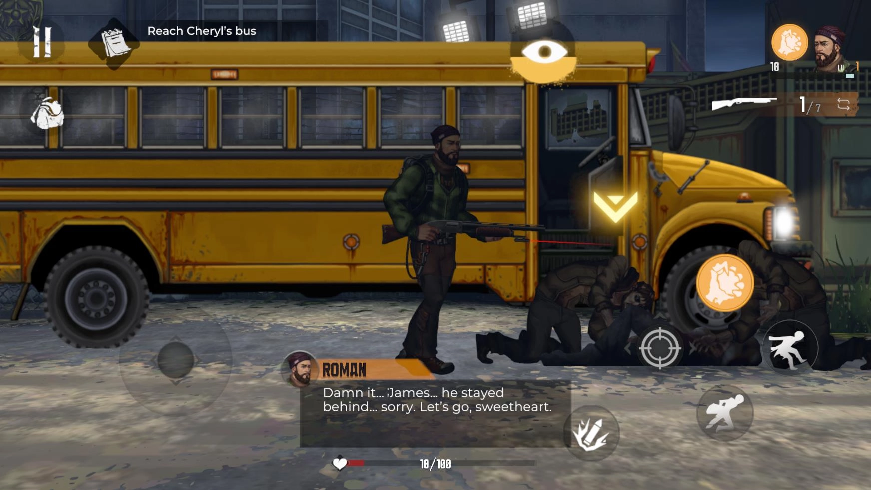 4、当遇到僵尸怪物后可以点击射击按钮来进行攻击,使用黄色按钮可以投出手榴弹攻击敌人。