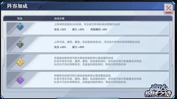 若可变、通用、重型、机动各上阵一台机体,则可激活20%的攻击和耐久阵容加成,这种阵型在对抗敌人阵容复杂的情况下更具优势。