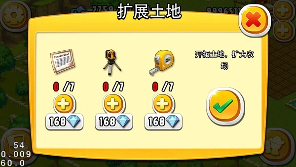 可以消耗奖券,将土地升级为金土地,金土地可以种植高产量的杂交作物(杂交作物需要研究所建筑,消耗5000金币)。点击土地旁边的感叹号即可升级