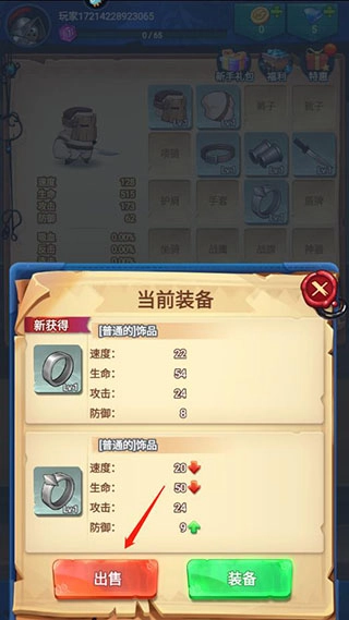 3、如果出现重复的装备,就需要玩家选择是装备上还是出售掉,此时大家要对比两件装备的速度、生命、攻击和防御等数值,选择属性值高的装备,就把剩下的出售掉;然后继续开宝箱;