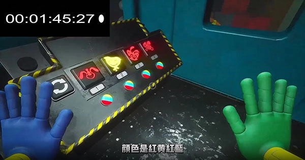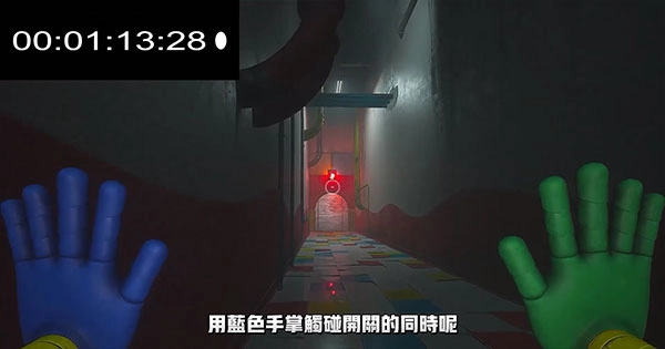 6、当手套收集完成会自动的带入手中,这个时候可以看到在墙的两侧有红色、蓝色的手印,玩家只需要将手套对着相对应的区域即可将房门打开。