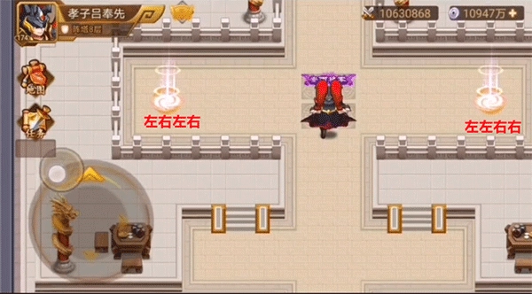 七、第七层名为二龙出水阵。破阵语:左三点,右中元。如下图所示走,即可破阵,注意,左边和右边阵眼没有顺序分别。激活阵眼即可破阵。