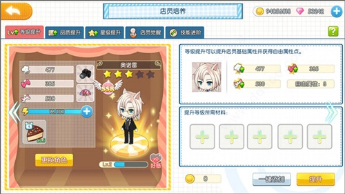 等级提升:提升等级可以用经验书也可以吃其他店员来升级(好残酷的喵星人世界)……可以手动挑选材料也可以交给系统君一键添加。这里要说一下,只有珍贵度在R以下的路人店员也就是N级店员会被一键添加,所以店长们不用担心自己心水的小哥哥会遭遇被吃掉的命运了。