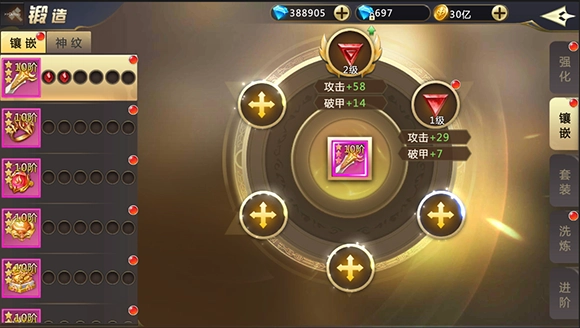 高阶的装备拥有特定的宝石镶孔,玩家可以镶嵌生命或攻击类宝石给装备,宝石可以通过商城直接购买,也可以打怪获得合成材料逐步合成高级宝石。