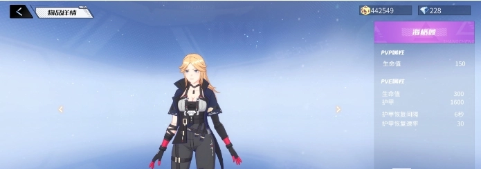 那我们接着来看看海格薇的PVE属性,她生命值仅有300点,护甲则能达到1600点,护甲恢复间隔6秒,护甲恢复速率为30。她的生命值是所有女性角色中最少的一位,护甲却是女性角色里最高的。