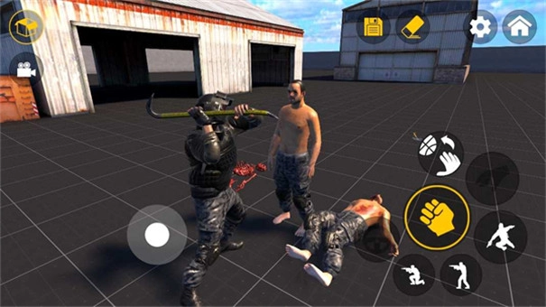 2、进人沙盒世界,通过左右两侧的虚拟按键控制人物的移动跳跃蹲下射击等;