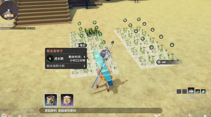 在「田地」中播种后,冒险者可浇水、施肥加速花卉生长,通过授粉改变花卉性状,从而收获不同品种的成熟花朵。