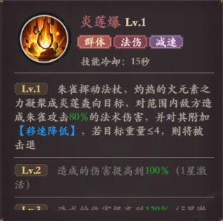 朱雀主动挥动法杖对范围敌人照成自身攻击力的法术伤害,并对其附加【移动速度降低】的效果,并且目标重量≤4的时候,会照成击退。这个技能是关键是给对方上减益效果和照成击退,可以很好的让敌方难靠近朱雀,从而保证朱雀的生存几率。