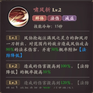 风伯主动对范围内的敌人释放一次攻击,对其照成风伯攻击力的法术伤害,并有概率对敌人施加【法防降低】效果