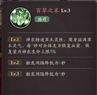技能描述:神农精通草木灵性,周身溢满草木灵气,每7秒对全体友方恢复血量,恢复量为神农生命上限5%