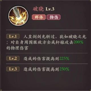 技能描述:人皇剑剑光斩过,犹如破晓之光;对自身周围服敌方全成轩辕攻击200%的物理伤害