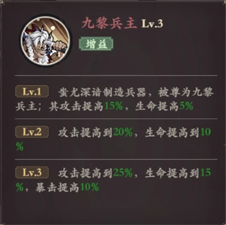 技能描述:蚩尤深谙制造兵器,被尊为九黎兵主;其攻击提高15%,生命提高5%