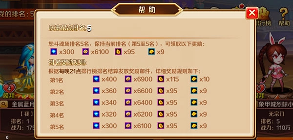 每天21:00会按照当前的斗魂场排名,为玩家发放奖励,包括钻石、斗魂币、培养石和金魂币等奖励。