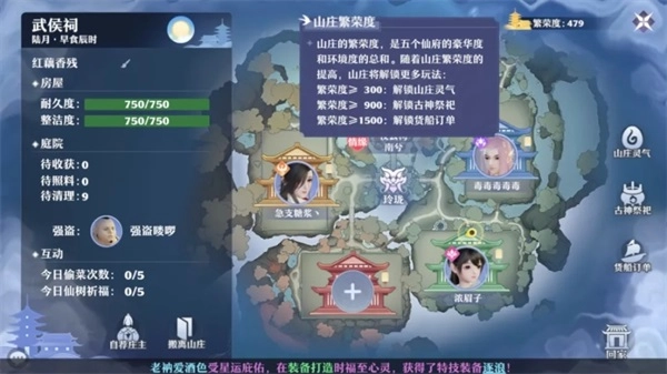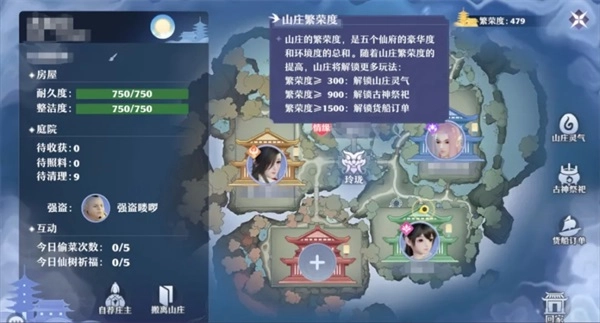 山庄会不定期刷新强盗,对战难度较低,获胜后会给经验、铜钱、概率获得家具图纸、种子,将种子种下,就可以进行仙树祈福了。