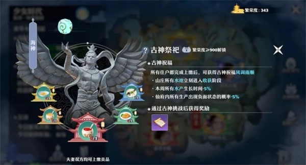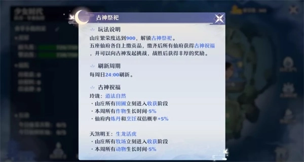 当山庄繁荣度达到900,可以解锁古神祭祀玩法。当山庄所有道友上缴道具后,即可进行古神挑战,挑战成功即可获得当周古神的祝福。
