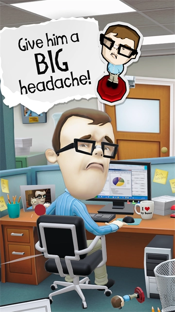 办公室捣蛋鬼游戏中,玩家的目标简单而直接:折磨面前那个讨厌的员工。游戏提供了超过30种不同种类的道具,玩家可以通过游玩逐渐解锁。这些道具包括墨水喷剂、粘性胶水、噪音制造器等等,每一种都对那位令人讨厌的员工产生显著的效果。