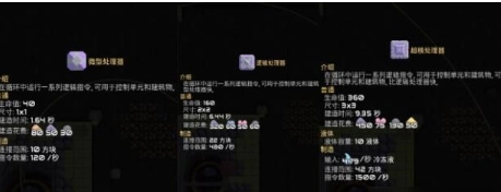 其中最核心的建筑就是3种处理器(包括微型处理器、逻辑处理器以及超核处理器)。所有的处理器指令都是在这些处理器类型的建筑中运行的。这三种处理器没有本质上的差别,主要的差距在于:运算速度、建造消耗、运行条件以及连接范围。它们的差距在它们的属性面板中可以很容易地被看出来(见下图)。