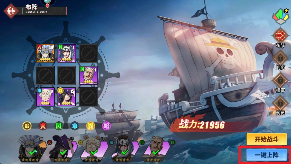 1、选择适合的角色阵容出战,亦可使用一键布阵功能快速安排队伍。