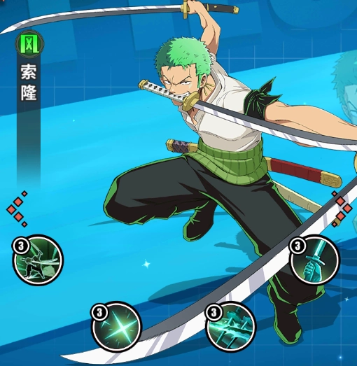 1、主动技能:千八十烦恼风。未佩刀时,索隆凭借气流和武装色霸气发动攻击,对敌方后排随机两目标造成208%物理伤害,并有60%几率施加法术禁锢效果。若目标为法师,伤害提升30%。