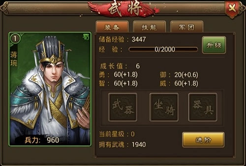 每个武将可以装备三种装备:武器,战马和器具。以上三种装备均可为武将提供属性加成。