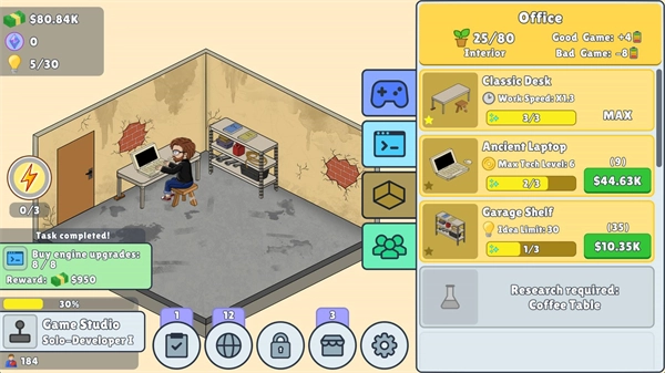 6、点击第三个按钮可以升级你的开发设施,等级越高制作的游戏越好。