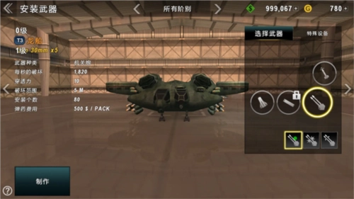 在游戏的workshop(制造间)里面就可以进行直升机的改造了。先来看看都能改造哪些内容,首先可以进行EAUIPMENT(设备)改造,点击EAUIPMENT(设备)下的2个按钮,选择是否为直升机安装上该设备,当然是需要花费一定金钱的,具体的信息左边的文字里有;