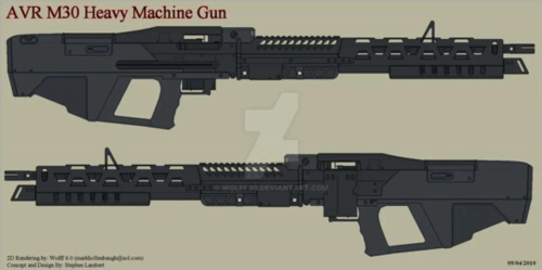 改良版M60机枪:配备了便于射手像持步枪一样握持枪支的护手(由于潘多拉星重力较低,整枪重量减至8.5公斤),采用圆形弹鼓供弹。此外,还有专门为阿凡达打造的AVR M30机枪。