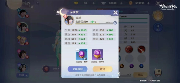 为仙友赠送仙丹可提升仙友的亲密度,亲密度等级提升后,仙友的属性也会得到提升;部分仙友更可通过进阶提升品质,如阿笙、碧瑶等;大家可以无损重置仙友亲密度,返还全部已赠送的仙丹。