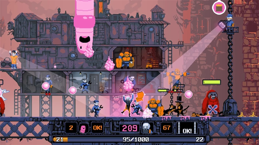 1、以一种特殊的非暴力方法来收集小鸡和生产能量,用于升级城市和解锁技能。城市会给你配备NPC助手和战队队员,而技能会让弗拉基米尔击败对手的方式越来越酷炫,比如召唤一只粉红色的虫子来减慢你的敌人,然后用一把巨大的扳手完成毁灭性的打击。