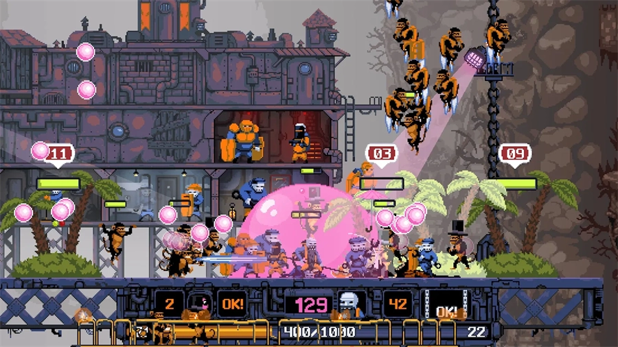 1、冰冷地狱游戏采用了攀登式的关卡挑战模式,你可以控制你的小弟来让平台不断上升,并打败入侵的猴子。