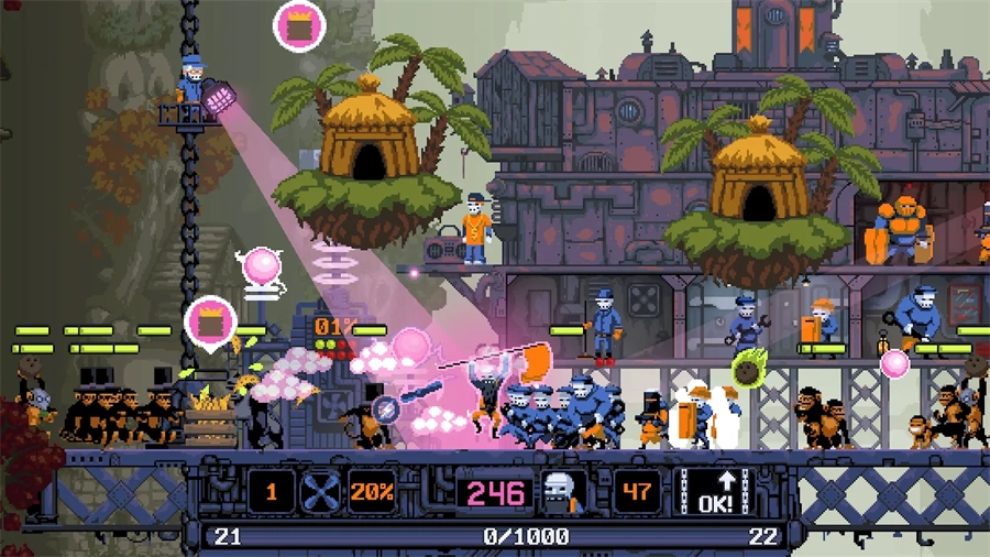 首先升级血量和移动速度,移动速度在打boss很重要,小动作得躲,其次我觉得是掉两个球和有概率不消耗技能,其次就是攻速,最好血量优先升级,其他平均升级下就行了,地图两边的铁链需要你去靠近,然后消耗一个机械师跟班来修铁链,平台才会往上升,关卡才会继续,善用摩托车,但也别一直用,跟你小队一起才最好,记住只有你攻击那些跟班们才会攻击不然只会跟着你到处跑,boss其实很简单,根大部分游戏一样,你慢慢就会发现规律,你的跟班可以挡一些boss的普攻让你在后边输出,时刻注意平台上人和奇怪的东西以及物品,尽快打掉,比如箭靶,白菜,香蕉船有三个投手,恐吓机械师猴子,推土机,尽快打掉。像尖刺轮出租车扳手龙卷风什么的最好留着清屏,1技能喷火的就很好用,配合摩托冲刺再加喷火,喷火对重叠的敌人十分有效。
