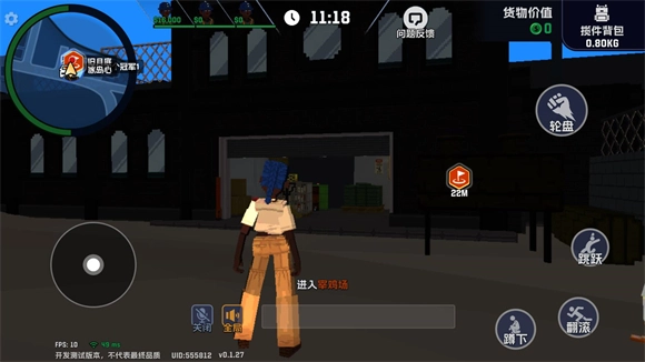 4、正式开始后玩家左边控制角色移动,右边是跳跃、翻滚、蹲下,点击轮盘可以装备携带的武器和使用道具。