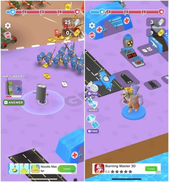 一方面玩家需要收集战场上的战利品提升自己的军衔,为招募的士兵提供额外的辅助增益;另一方面,也需要玩家同时兼顾轰炸机、核武器等装备的使用,各项军事设施的建设也在玩家的掌控之中。