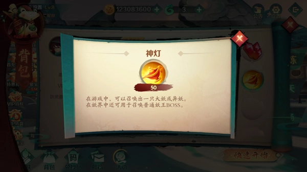 8、神灯:在游戏中,可以召唤出一只大妖或异妖。在妖界中还可用于召唤普通妖王BOSS。