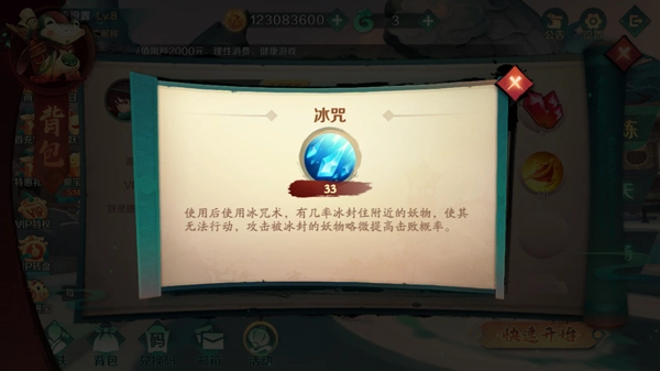 5、冰咒:使用后使用冰咒术,有几率冰封住附近的妖物,使其无法行动,攻击被冰封的妖物略微提高击败概率。