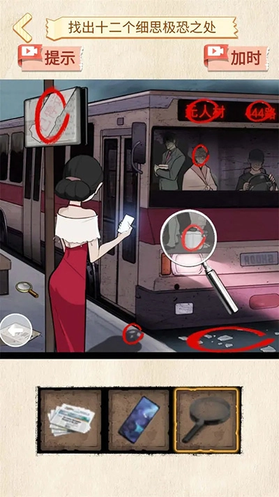 恐怖公交车这款找茬小游戏以恐怖元素为背景,带来了别具一格的解谜体验。玩家将置身于一辆阴森可怖的公交车内,面对车厢里各种细节上的异常。游戏开始时,玩家能够轻松发现一些明显的不对劲之处,但随着关卡的不断深入,隐藏的异样会越来越微妙,考验玩家的观察力与耐心。昏暗的光线、怪异的氛围以及随时可能出现的细节变化,让游戏的紧张感大大增强,营造出沉浸式的恐怖氛围。